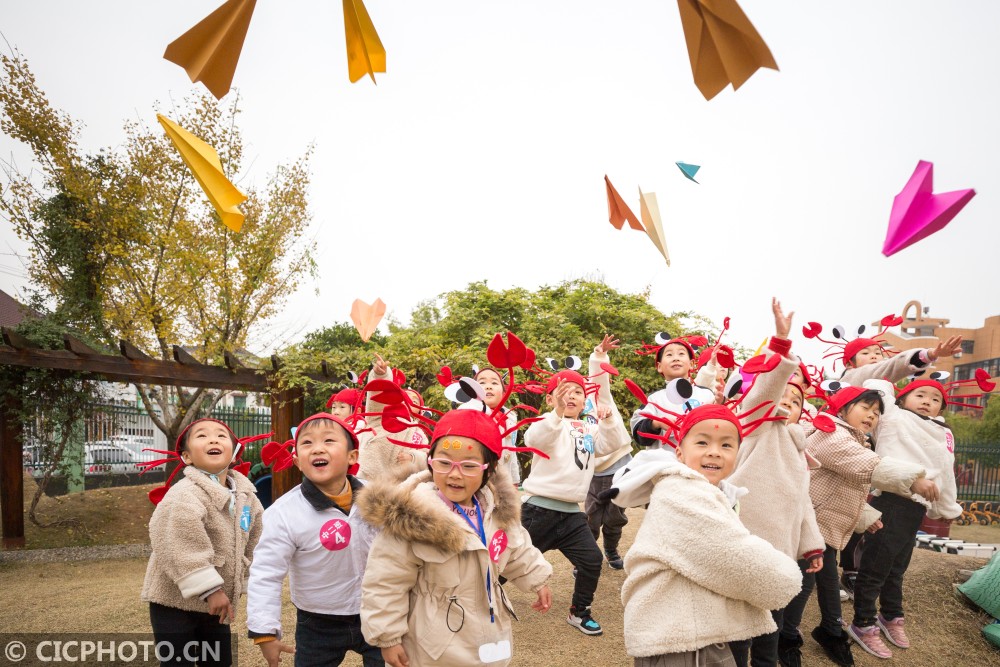↑2020年12月8日,浙江省湖州市长兴县洪桥镇中心幼儿园的孩子们在放飞纸飞机。CICPHOTO/许斌华 摄