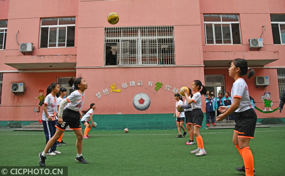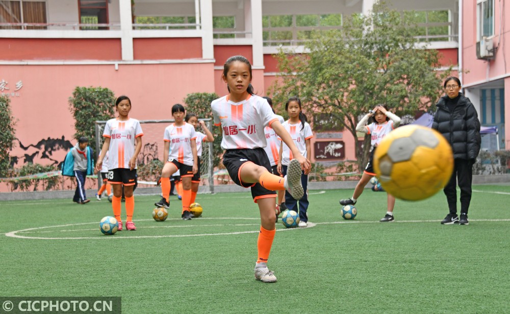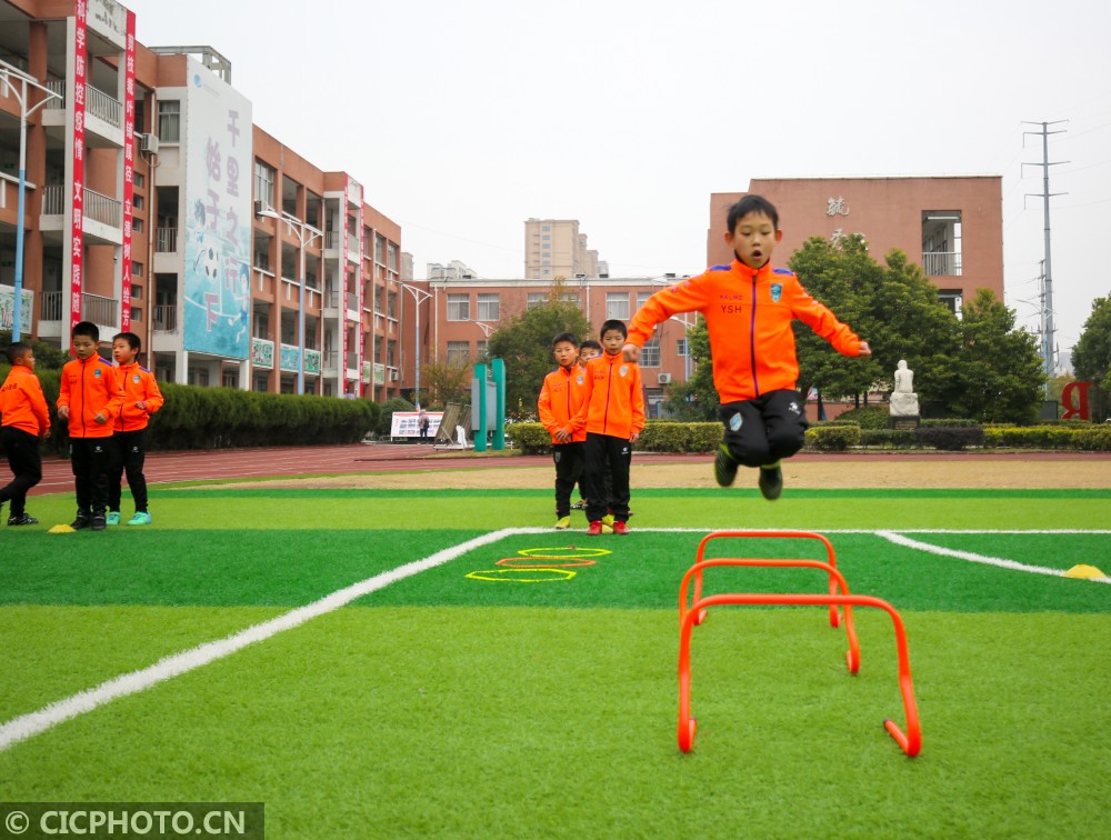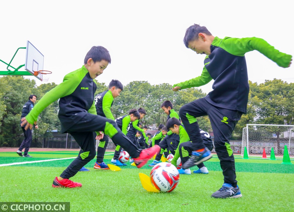 ↑2020年12月9日,浙江省台州市仙居县第一小学足球队的学生在操场上训练。CICPHOTO/王华斌 摄