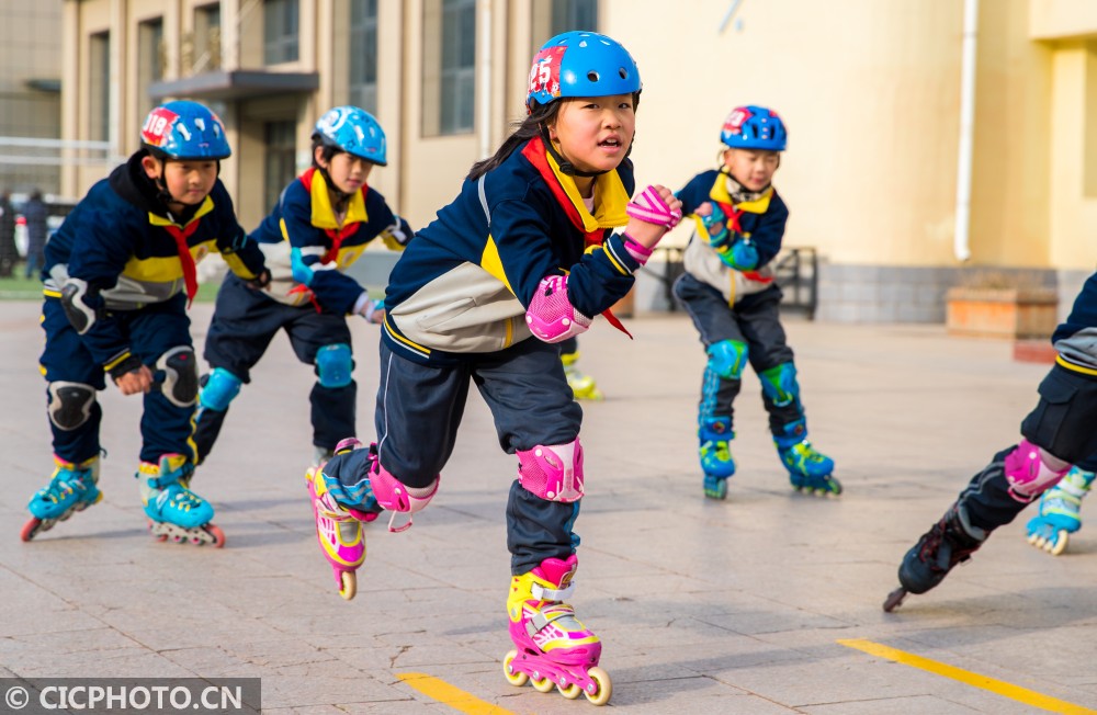 ↑2020年12月8日,内蒙古呼和浩特市玉泉区巧尔齐召小学学生在进行轮滑训练。CICPHOTO/丁根厚 摄