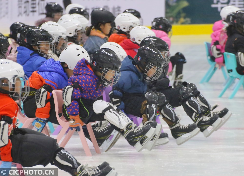 ↑2020年12月8日,山东省烟台市福山区福海路小学的孩子们在烟台华星冰上运动训练中心学习冰上运动第一课。CICPHOTO/唐克 摄