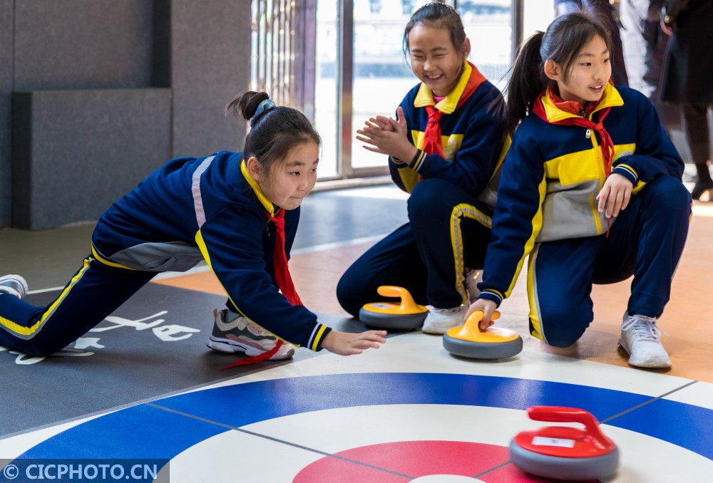 ↑2020年12月8日,内蒙古呼和浩特市玉泉区巧尔齐召小学学生在进行旱地冰壶训练。CICPHOTO/丁根厚 摄
