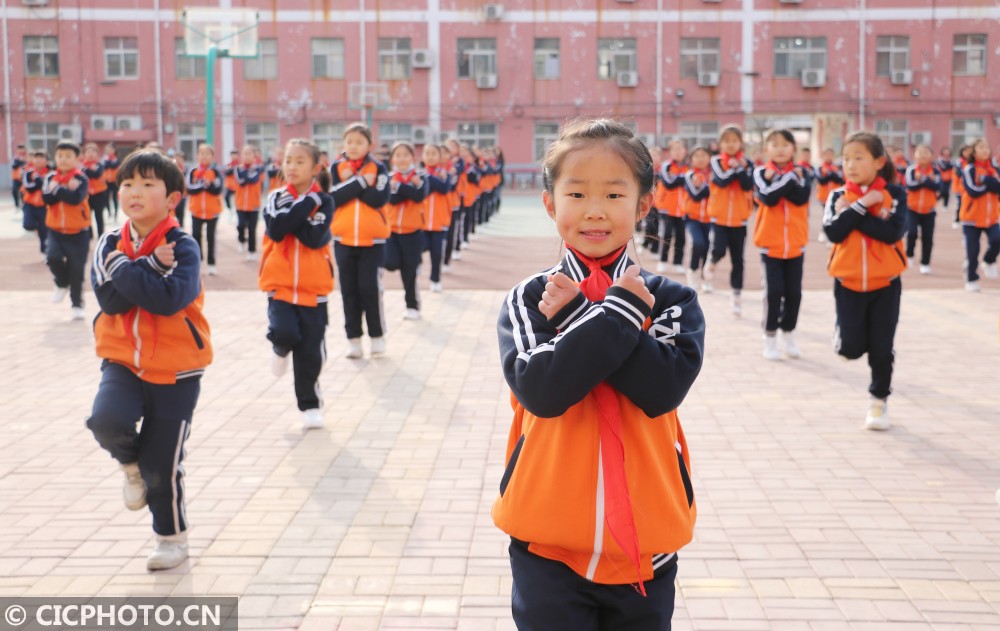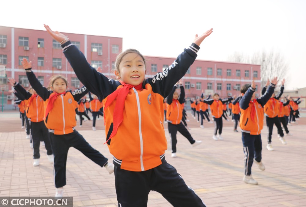 ↑2020年12月8日,河北省邢台市广宗县第一小学的学生在操场上做课间操。CICPHOTO/梁智晓 摄