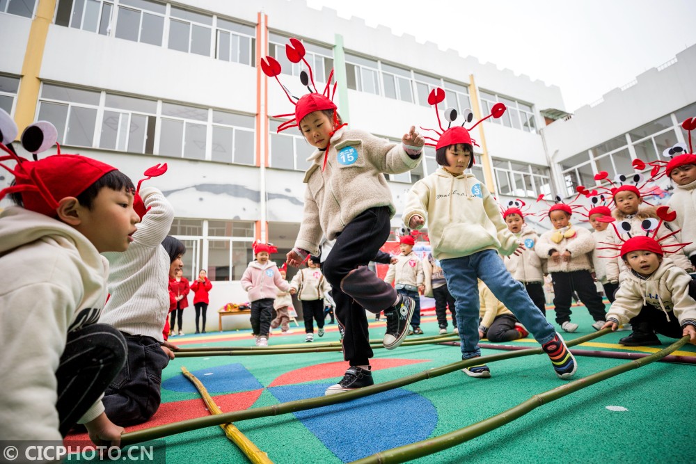 ↑2020年12月8日,浙江省湖州市长兴县洪桥镇中心幼儿园的孩子们在玩跳竹竿游戏。CICPHOTO/许斌华 摄