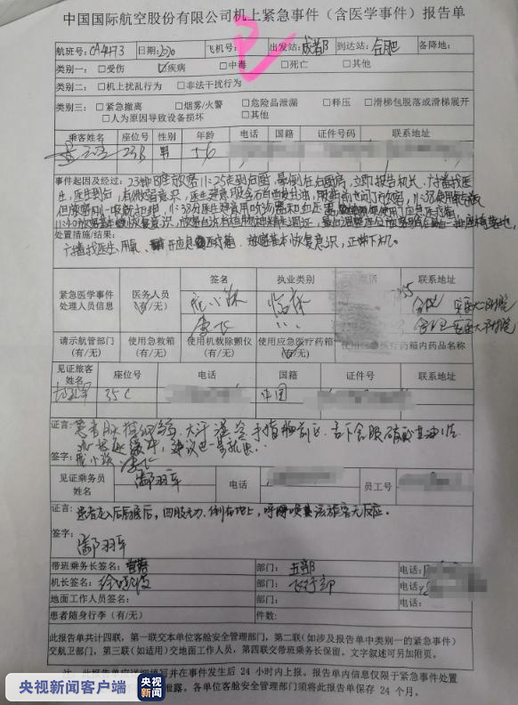 近日,在由四川成都飞往安徽合肥的CA4473次航班上,发生了惊险又暖心的一幕。一名乘客在飞行途中突发晕厥,两名医生在万米高空为其紧急救治,帮助其脱险。