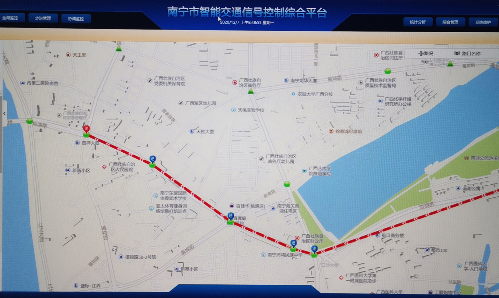 此次救援,“南宁市智能交通信号控制综合平台”的远程信控发挥了重要作用。指挥人员可以根据实际需要,利用该平台即时设计生成“绿波带”线路预案,远程控制沿途路口联网信号机,既能保证被救助车辆无需等待、一路绿灯,又能最大限度减少对其他方向车辆的影响,大大节约了时间和警力。