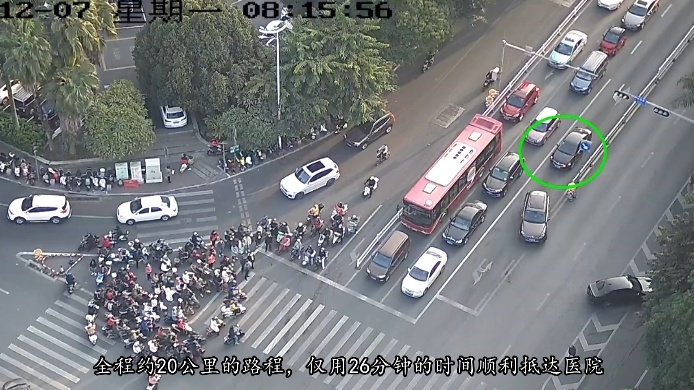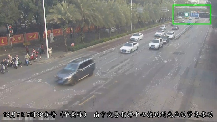 交警指挥中心迅速启动应急救援机制,第一时间引导刘先生避开交通堵点,并首次通过“南宁市智能交通信号控制综合平台”进行远程信号控制,为受助车辆提供“绿波带”保障。
