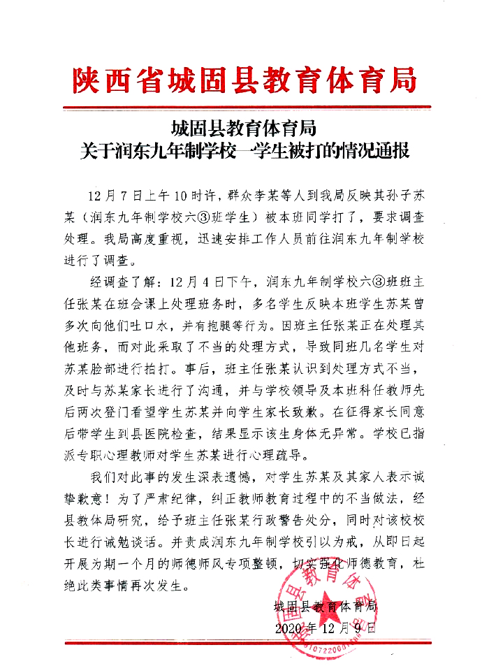 近日,陕西城固县有家长实名举报其子苏某行就读城固县东郊润东学校六年级,因与同学发生摩擦向同学吐口水,被班主任指使班上10名同学向其扇耳光,每人10下,共100下。导致该学生脸部肿胀,耳根疼,无法上课,给孩子造成巨大心理阴影。12月9日,城固县教育体育局对外通报了此事的调查结果。全文如下: