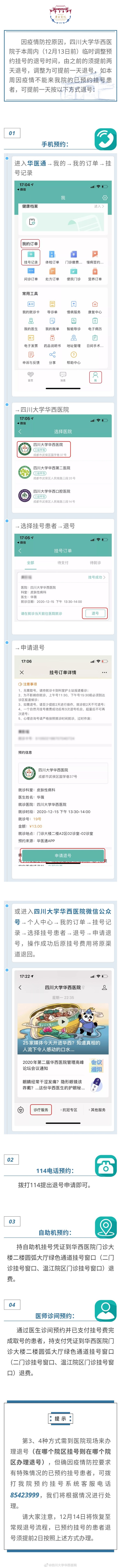 记者从四川大学华西医院了解到,因疫情防控原因,华西医院于本周内(12月13日前)临时调整预约挂号的退号时间,由之前的须提前两天退号,调整为可提前一天退号,如本周因疫情不能来华西医院的已预约挂号患者,可提前一天按以下方式退号,明天开始实行,也就是说明天可退后天的号。具体的退号方式请看图了解↓↓