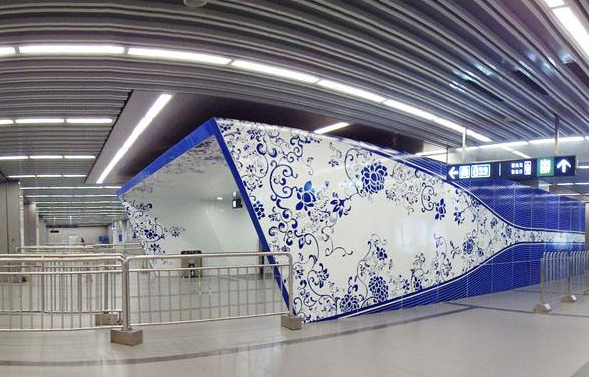 北土城站紧邻元大都城墙遗址,采用“中国风”的设计,采用体现中国文化的“青花瓷”作为装饰图案,屏蔽门上也印满了中国古典元素,白色吊顶则是仿中国古代藻井的形状。