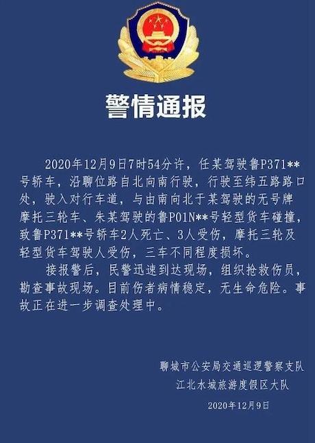 总台央视记者今天(9日)从聊城市交警部门获悉,2020年12月9日7时54分许,任某驾驶轿车,沿聊位路自北向南行驶,行驶至纬五路路口处,驶入对行车道,与由南向北于某驾驶的无号牌摩托三轮车、朱某驾驶的轻型货车碰撞,致轿车内2人死亡、3人受伤,摩托三轮及轻型货车驾驶人受伤,三车不同程度损坏。