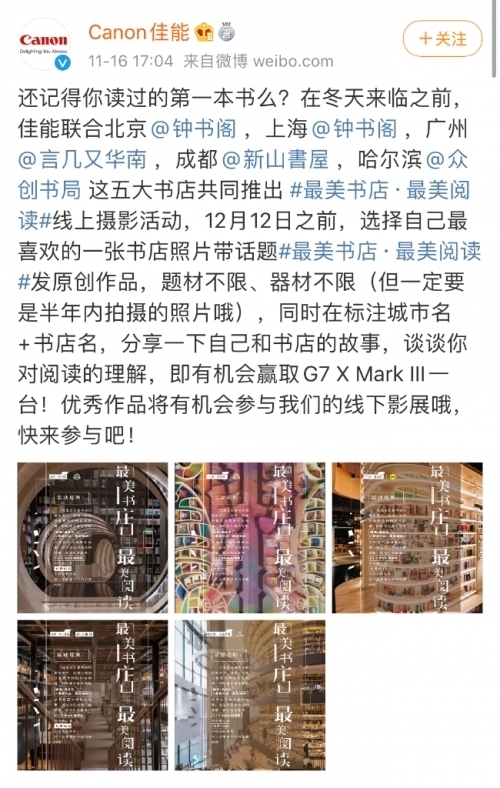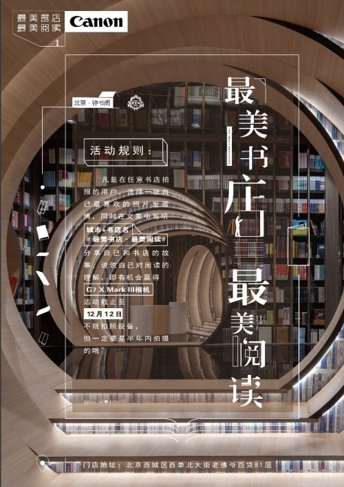 以影像产品及技术见长的佳能,便在2020年“全民读书月”开启前夕,启动了一项主题为“最美书店 最美阅读”的照片征集活动。如今,摄影已经成为了当代人记录生活、分享美好的一种方式。佳能作为一家影像企业,此次携手北京钟书阁、上海钟书阁、广州言几又、成都新山书屋、哈尔滨众创书局这五大知名书店共同举办线上摄影活动,鼓励更多人走进书店,并拿起相机定格书店之美,通过一张张精美的书店照片,吸引更多公众能够走进书店,拿起书籍,感受阅读之美。同时,本次摄影活动也不限制大众参与的拍摄器材或拍摄地点,只要是原创作品即可参与。活动仅仅上线两周时间,便收获了超过两千多名网友自发创作,积极参与讨论。