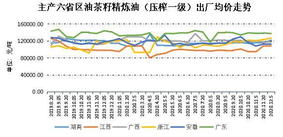 数据显示,截至12月5日,11月下半月全国重点省区油茶生产加工企业油茶籽精炼油(压榨一级)出厂均价较11月上半月小幅上涨。其中各省区涨跌不一,江西、安徽两省重点企业油茶籽精炼油(压榨一级)出厂均价较11月上半月基本持平;广东省重点企业油茶籽精炼油(压榨一级)出厂均价较11月上半月小幅下跌,跌幅为1.02%;湖南、广西、浙江三个省份重点企业油茶籽精炼油(压榨一级)出厂均价较11月上半月小幅上涨。