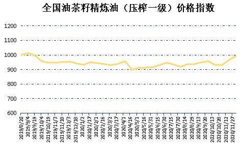 截至12月5日,全国油茶籽精炼油(压榨一级)价格指数报992.53点,较上一统计日(11月20日)968.58点上涨23.95点,涨幅2.47%,指数较上期小幅上涨;指数较基期下跌7.47点,跌幅0.75%。