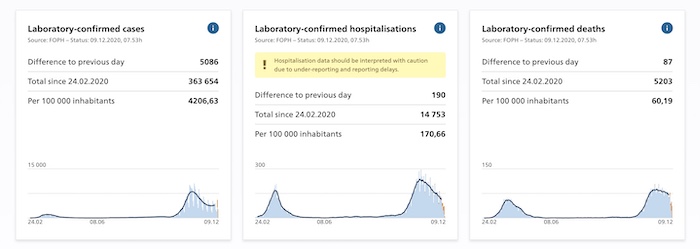 瑞士联邦卫生局最新数据显示,截至当地时间12月9日7时53分(北京时间12月9日14时53分),瑞士及列支敦士登公国新冠病毒累计感染病例363654例,相比前一天数据新增5086例;新增死亡87例,累计死亡5203例,新增住院治疗190例,累计住院治疗14753例。每10万居民中约4206人感染。