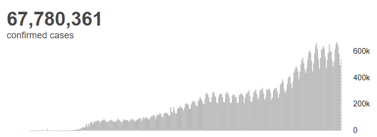根据世卫组织最新实时统计数据,截至欧洲中部时间12月9日16时22分(北京时间12月9日23时22分),全球累计新冠肺炎确诊病例67780361例,累计死亡病例1551214例。9日全球新冠肺炎确诊病例新增546703例,死亡病例新增10132例。(总台记者 朱赫)