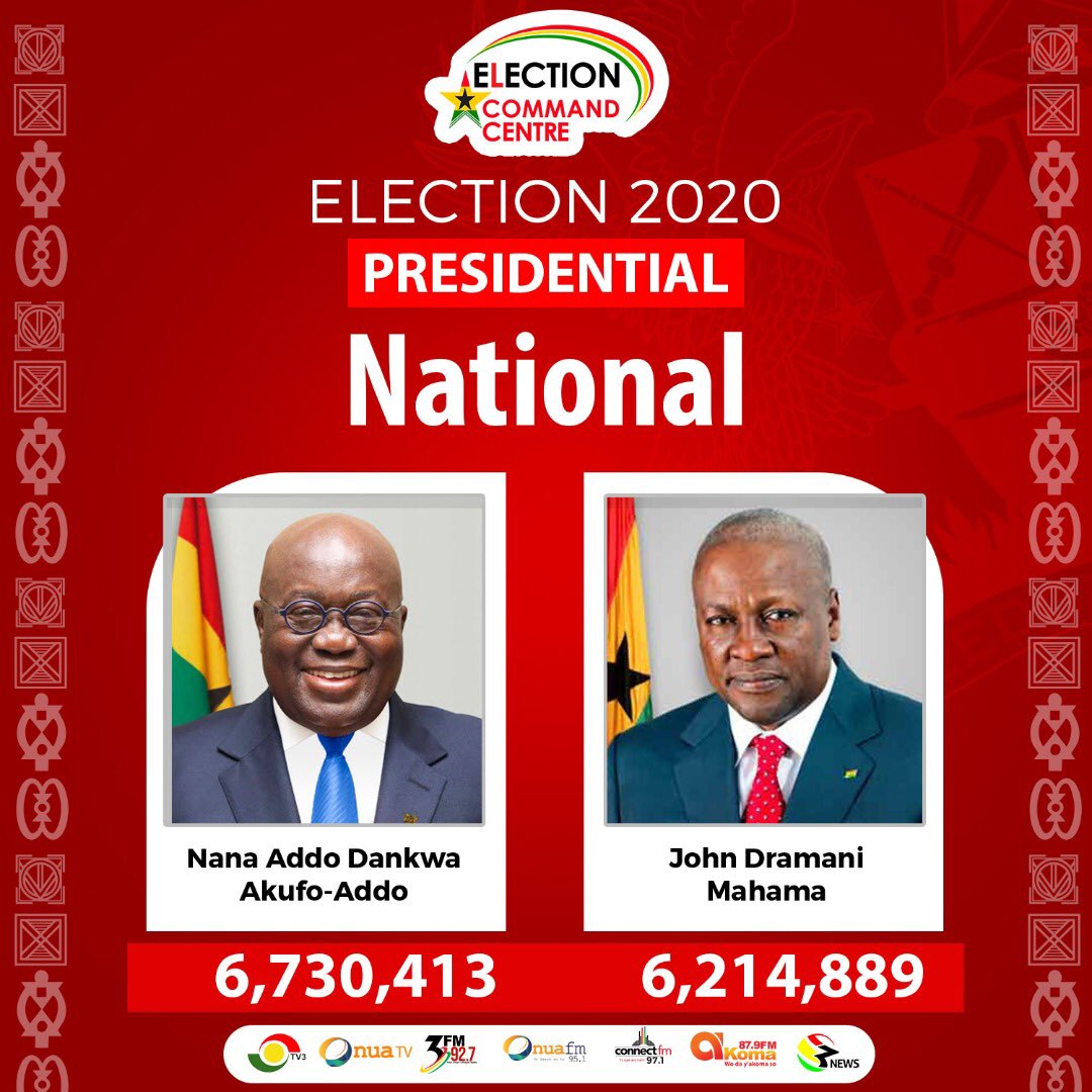 当地时间12月9日晚,在加纳2020年总统选举投票结束48小时后,加纳选举委员会公布了总统选举结果:新爱国党候选人、现任总统阿库福-阿多获得有效投票数的51.595%,以6730413票获胜成功连任;其最大竞选对手,前任总统、最大在野党全国民主大会党候选人马哈马获得47.366%的选票,以6214889票落败。两人票数之差为515524票。这是马哈马第二次在大选中输给阿库福-阿多。