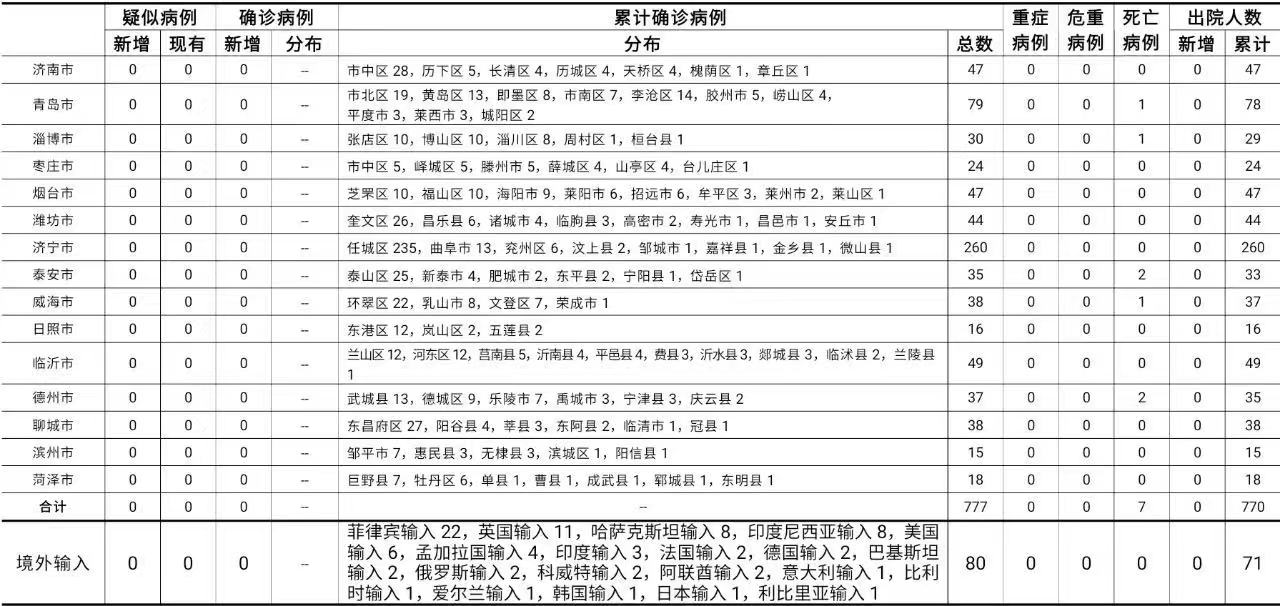 2020年12月9日0至24时:山东省无新增本地疑似病例、确诊病例。累计报告确诊病例777例,死亡7例,治愈出院770例。