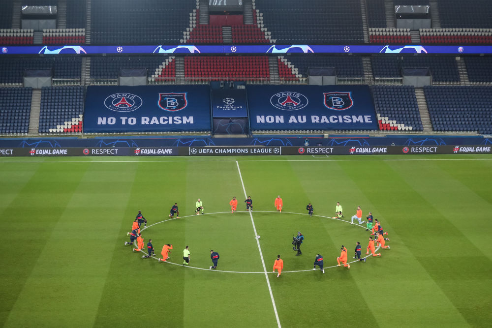 本场比赛原本定于8日举行,当时比赛进行到第14分钟时,伊斯坦布尔俱乐部认为来自罗马尼亚的第四官员科尔泰斯库在与主裁判哈泰甘对话时,针对伊斯坦布尔助教韦伯使用了种族歧视的言语。该队队员和教练组立即向裁判表示抗议,并获得“大巴黎”球员在一旁声援。在一番争执后,两队球员选择离开球场,比赛因此中断。