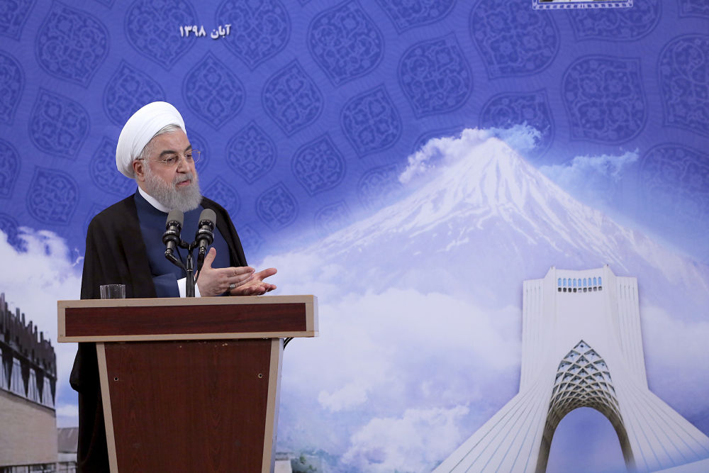 这张伊朗总统府官方网站提供的照片显示,2019年11月5日,在伊朗德黑兰,伊朗总统鲁哈尼发表讲话,宣布伊朗中止履行伊核协议的第四阶段措施。(新华社/美联)