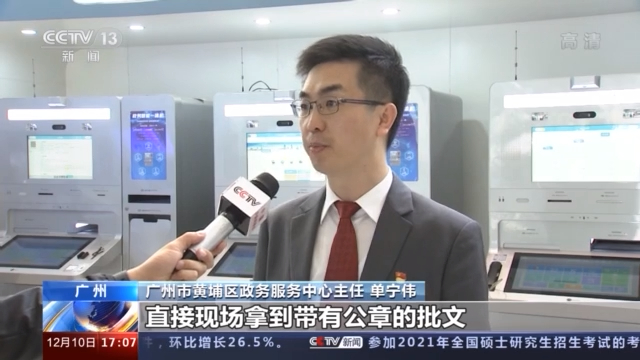 广州市黄埔区政务服务中心主任 单宁伟:我们把所有的事项进行了标准化,所有的审批的规则进行了结构化的一个处理,将通过机器智能化的识别研判来精准地完成智能的审批。我们“秒批”的流程来讲的话,我们可以实现即来即办,即来即批,直接现场拿到带有公章的批文。
