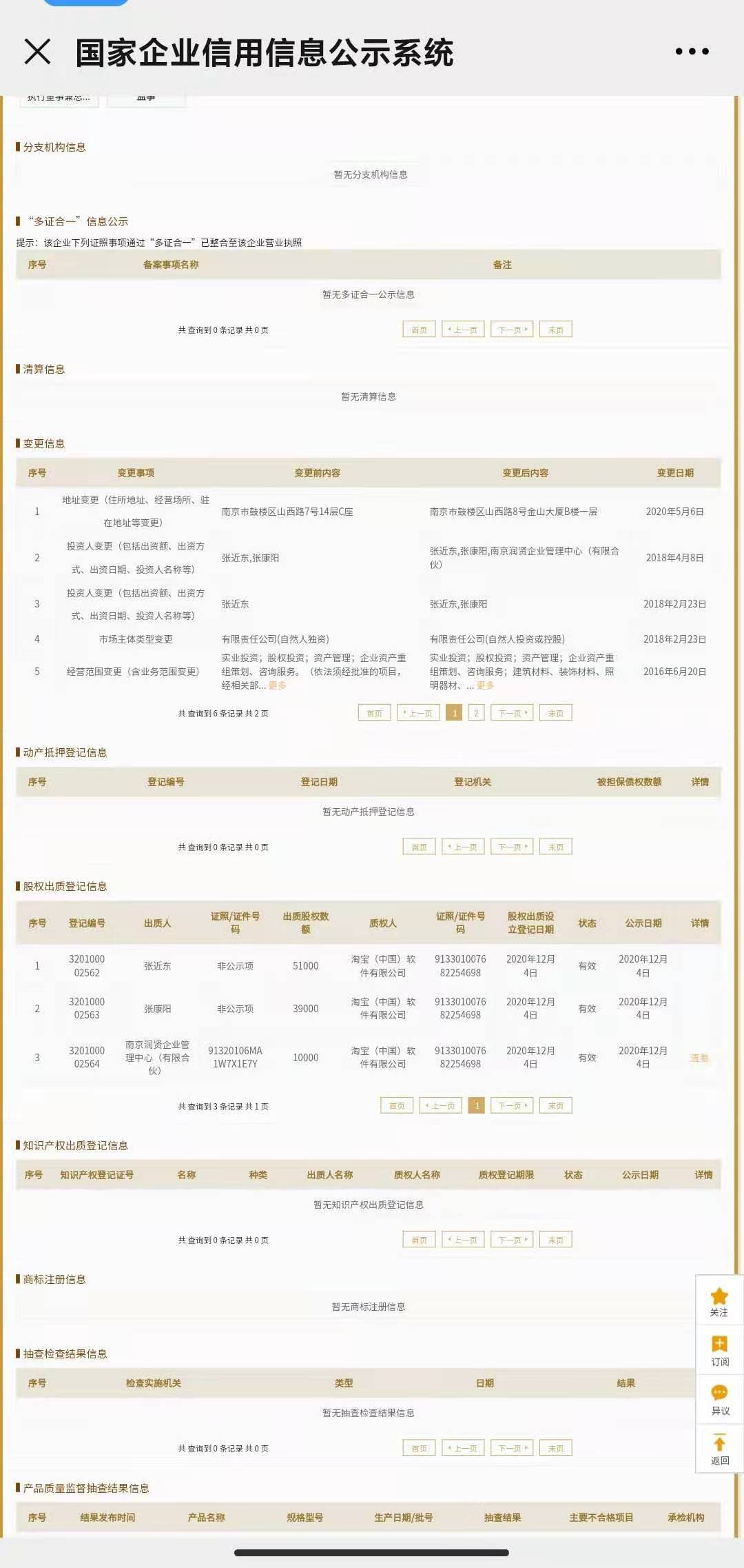 国家企业信用信息公示系统消息显示,苏宁控股集团股东张近东、张康阳及南京润贤企业管理中心(有限合伙)已将公司全部股权出质给淘宝(中国)软件有限公司。股权出质登记日期为2020年12月4日,合计出质股权数额10亿元人民币,与苏宁控股集团的注册资本金额等同。