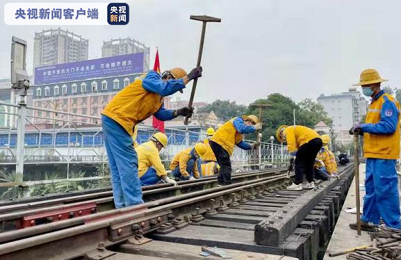 12月9日8时,云南境内中越边境南溪河上,中越铁路大桥上20余名身穿作业服、佩戴口罩手套的维修人员在中越铁路大桥中间,拆开桥枕护木上的螺纹道钉,对线路高低进行调整。