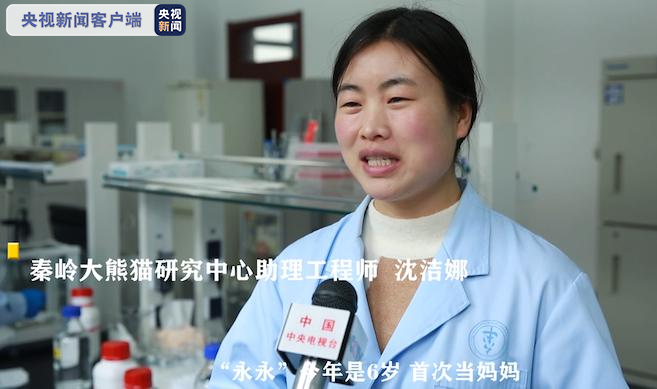 秦岭大熊猫研究中心助理工程师 沈洁娜:“永永”今年是6岁,首次当妈妈,总的来说,还是没有带幼崽的经验,而且初为“人母”,它的耐心也不是特别好,就是对人的依赖性比较大,比如说我们保育员过去,它可能就不是很想抱幼崽,就希望我们把幼崽抱走。