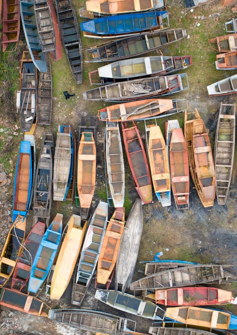▲这是2020年1月2日拍摄的湖北省宜都市枝城镇白水港村一处“上岸”的渔船堆放点(无人机照片),这些收回的渔船将集中拆解。新华社记者肖艺九摄
