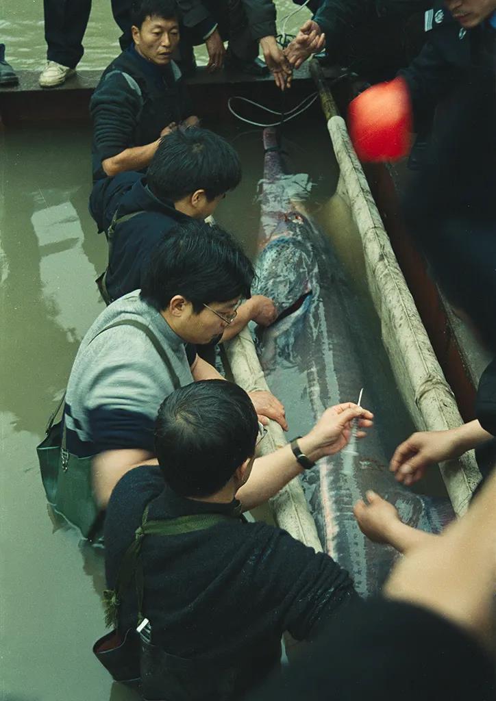▲2003年1月27日,在四川宜宾主城区附近的长江岸边,专家正在对一只白鲟进行救治。这只白鲟是1982年以来中国45次白鲟观测记录中最大的一只,也是记录的最后一只。张光金摄