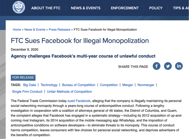 △美国联邦贸易委员会官网发布关于起诉脸书的相关消息