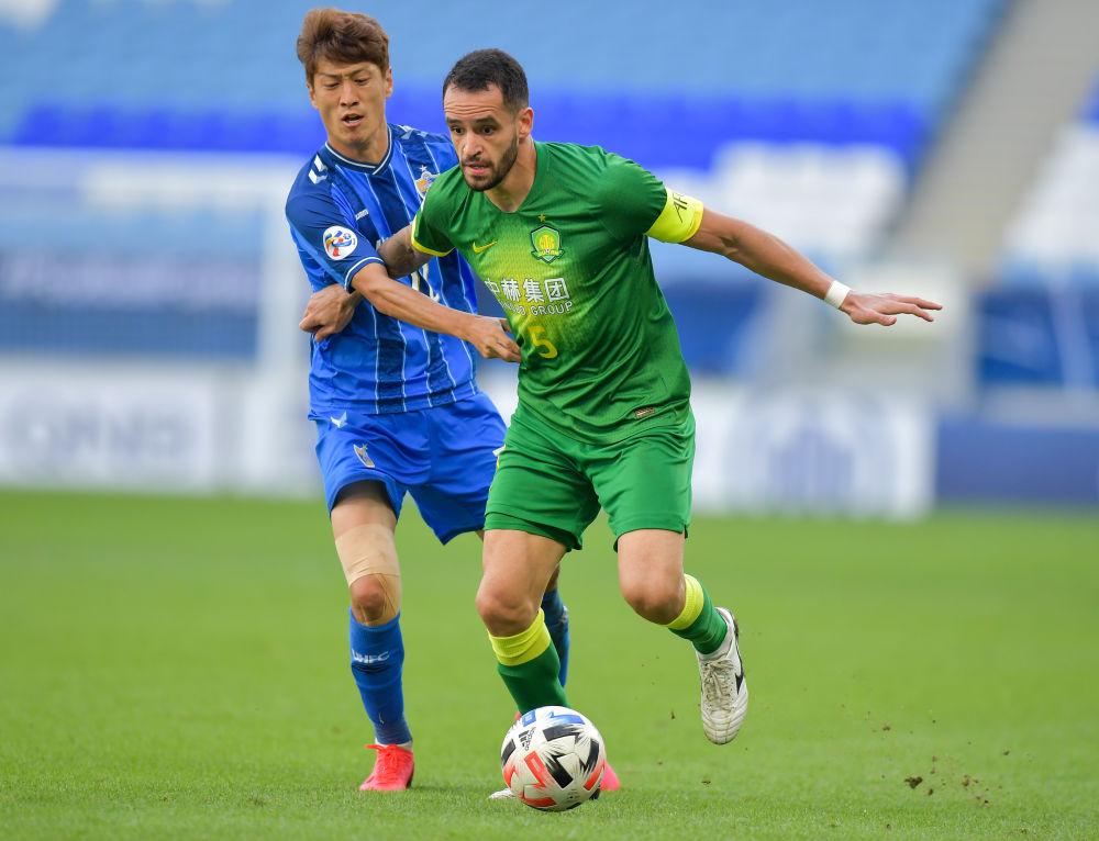 北京国安队球员李可(左)与蔚山现代队球员比约恩·马尔·约翰逊在比赛中拼抢。新华社发(尼库摄)