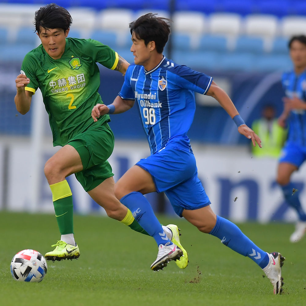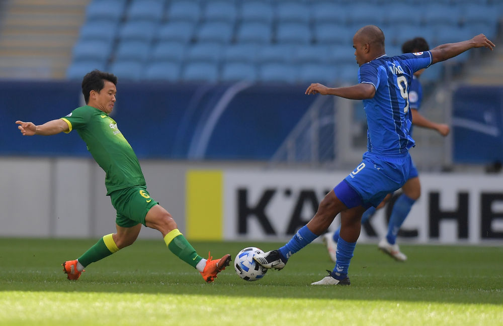 北京国安队球员金玟哉(左)与蔚山现代队球员李相宪在比赛中拼抢。新华社发(尼库摄)
