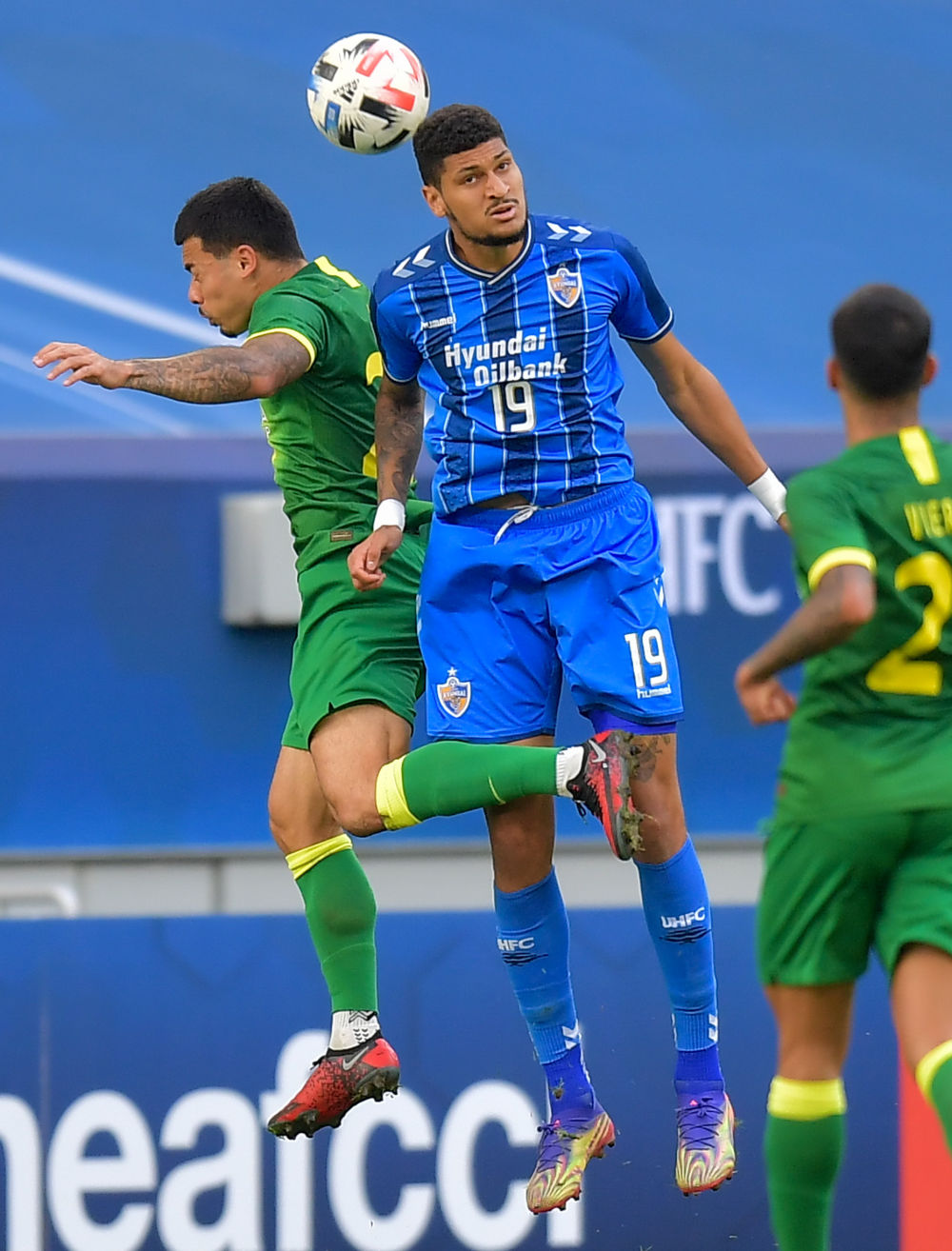 12月10日,北京国安队球员池忠国(左)与蔚山现代队球员儒尼奥尔在比赛中拼抢。新华社发(尼库摄)