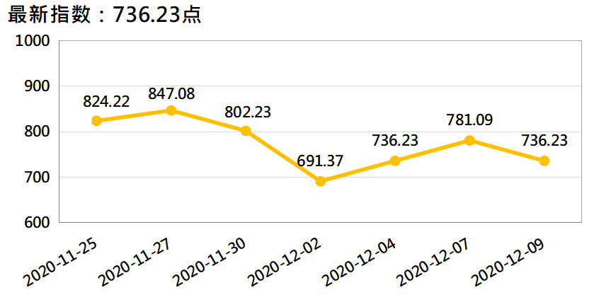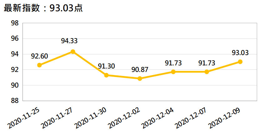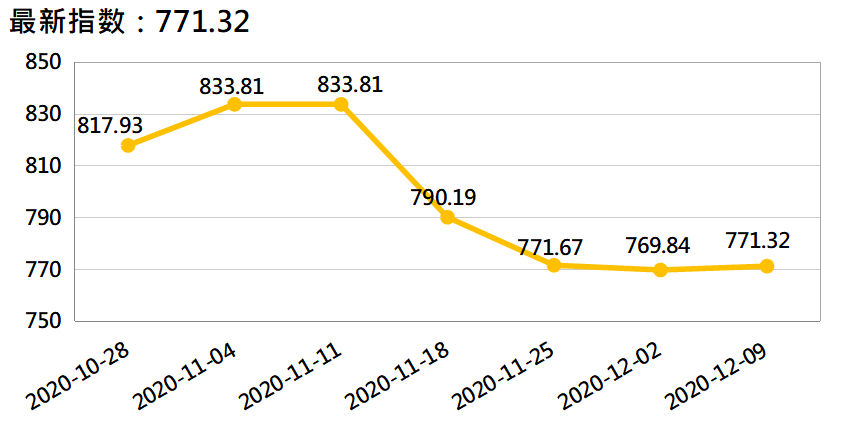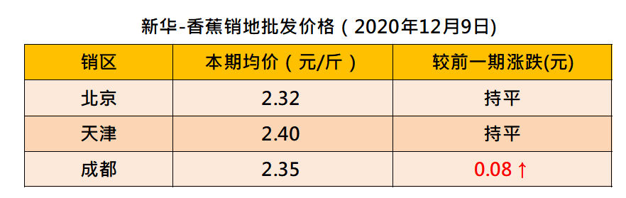 新华财经北京12月10日电(李水艳、李伯罧、汪伟坚)新华-中国香蕉产业四大指数显示,截至2020年12月9日,国内香蕉产地价格指数报93.03点,较上一发布日(2020年12月2日,下同)90.87点上涨2.38%;香蕉销地批发价格指数报96.82点,较上一发布日97.37点下跌0.56%;进口蕉价格指数报771.32点,较上一发布日769.84点上涨0.19%;皇帝蕉产地价格指数报736.23点,较上一发布日691.37点上涨6.49%。