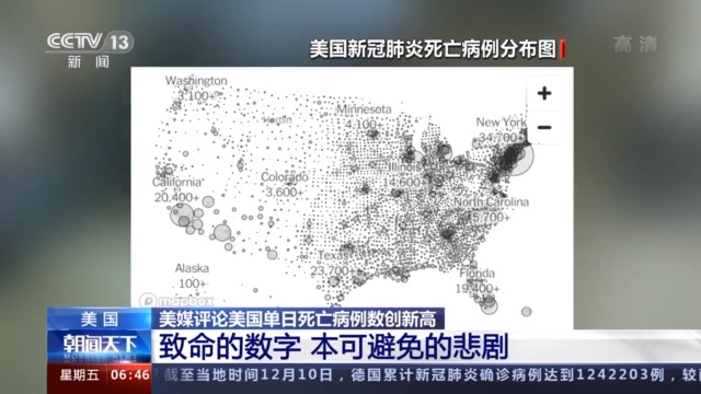此外,《纽约时报》还在当天用疫情地图展示了美国新冠肺炎死亡人士的分布情况。从图中可以看到,美国东部的死亡人数明显高于其他地区。