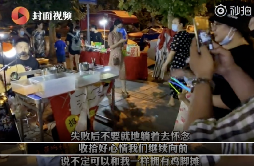 他带上吉他,到路边卖起了鸡脚,“失败后不要就地躺着去怀念,收拾好心情我们继续向前”。