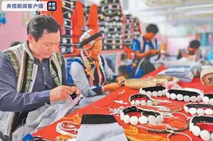 △易地扶贫搬迁群众在扶贫工厂加工少数民族服饰