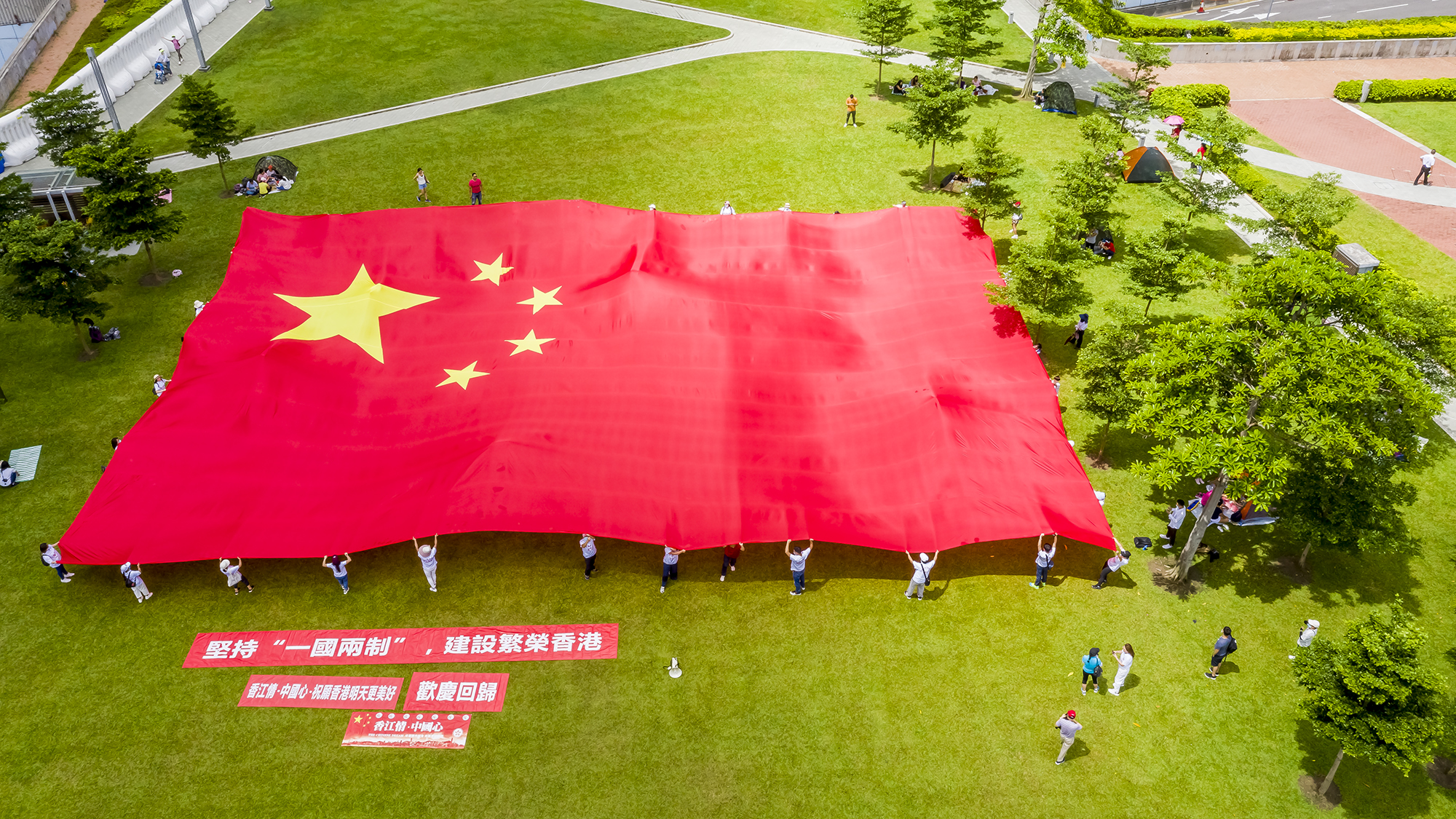 今年6月,市民在香港添马公园展示巨幅国旗(无人机照片)。新华社发