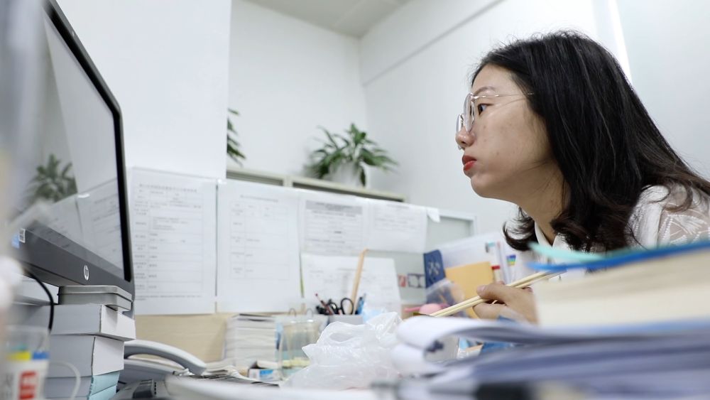 她一边吃饭 一边工作