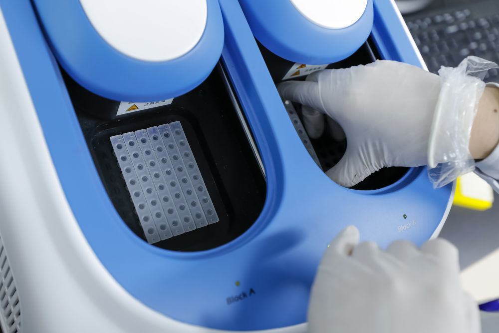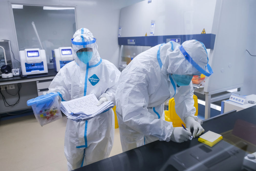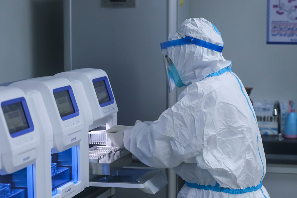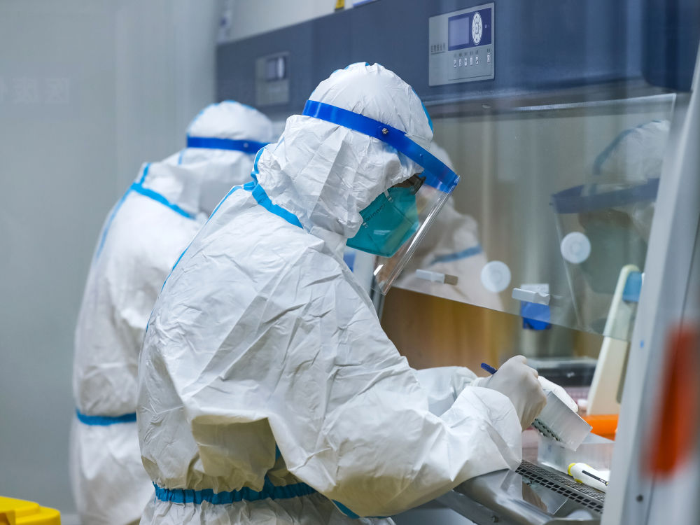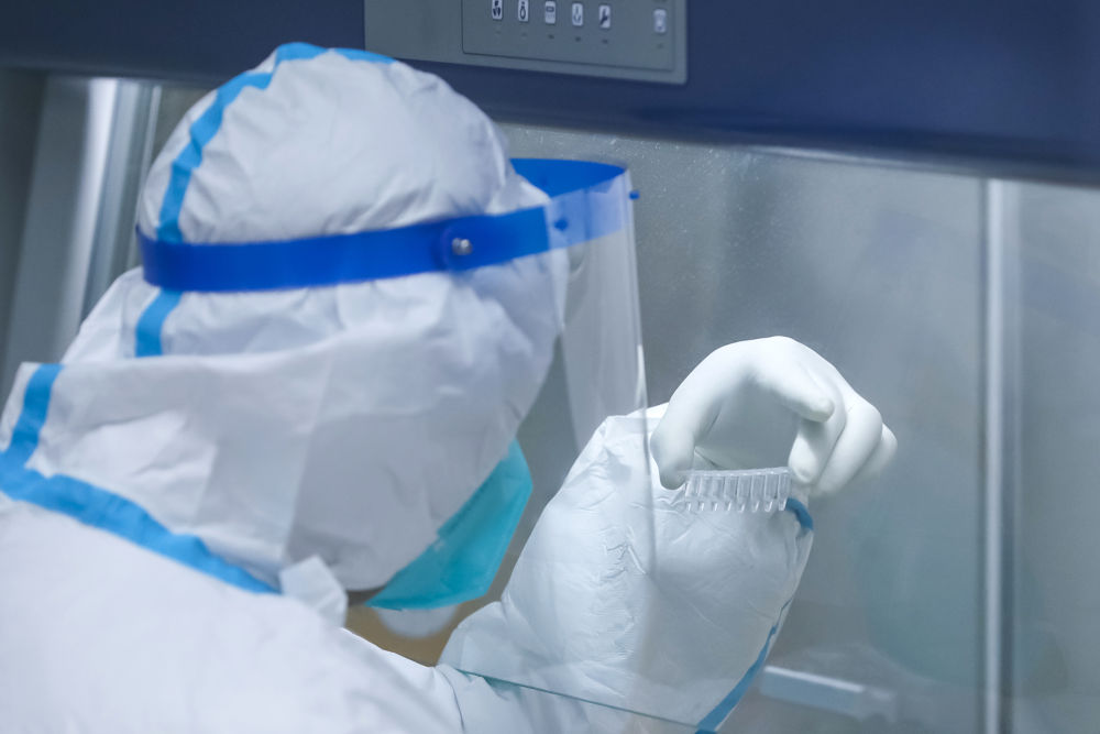 ↑ 12月10日,检测员在郫都区中医医院核酸检测室准备处理核酸检测样本。