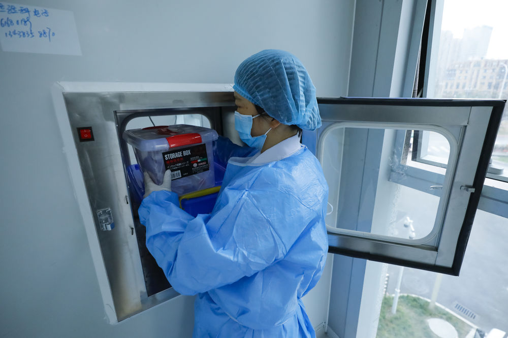 ↑ 12月10日,检测员在郫都区中医医院核酸检测室处理核酸检测样本。