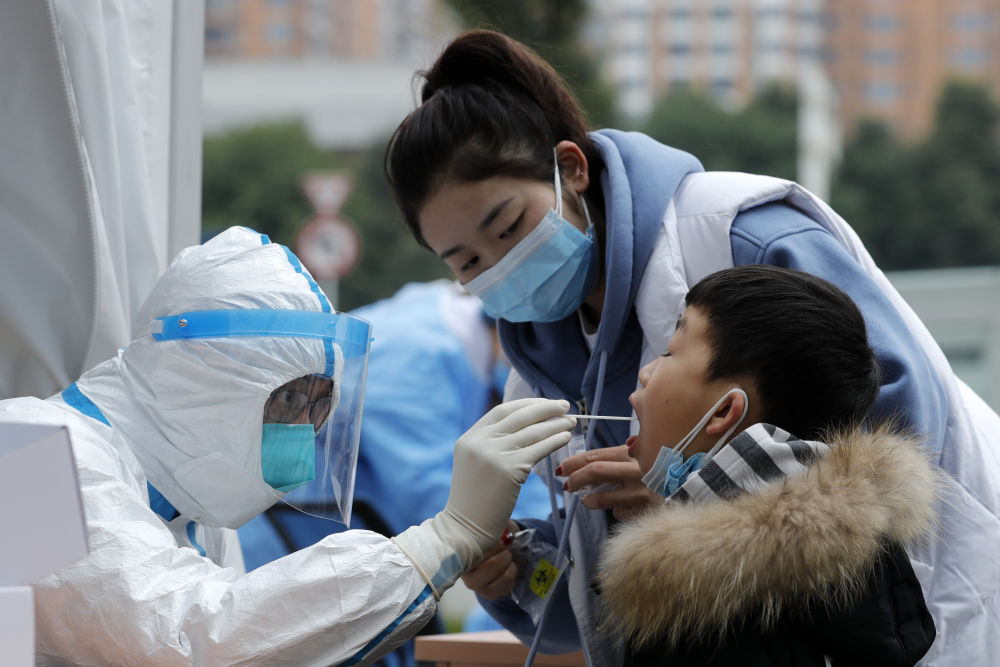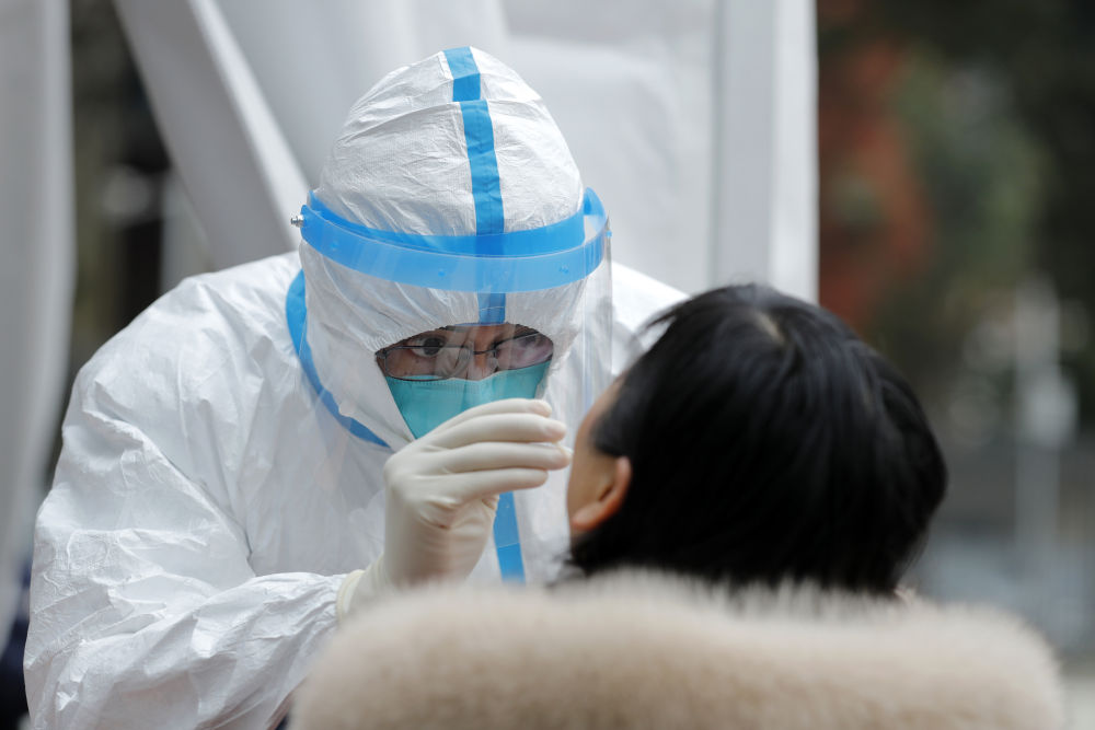 ↑ 12月10日,医务人员在郫都区中医医院核酸检测点进行核酸取样。