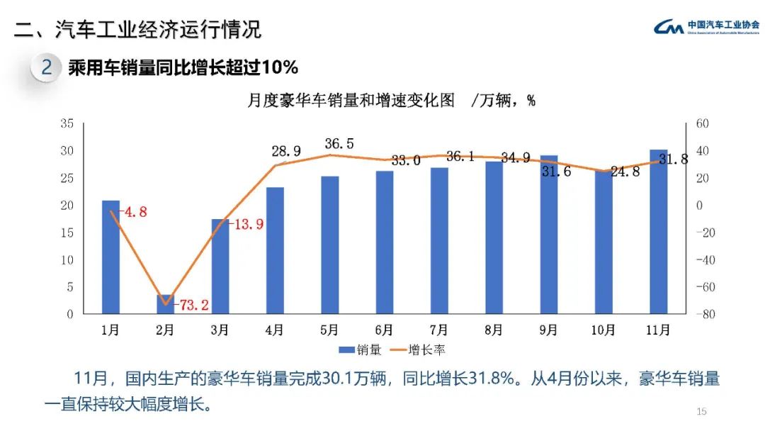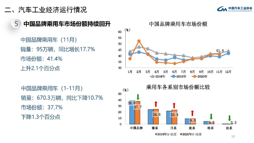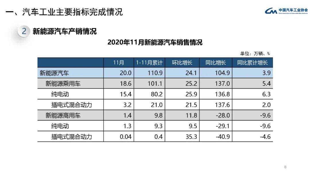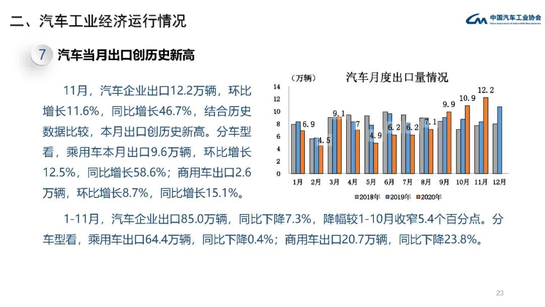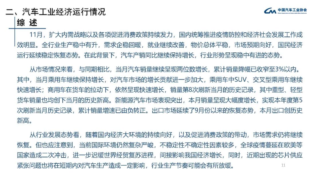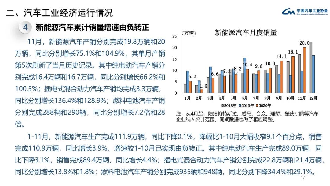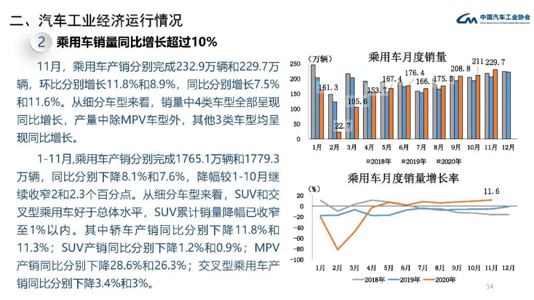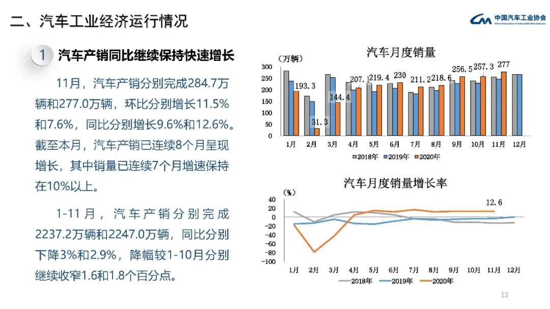 据中国汽车工业协会统计分析,2020年11月,汽车产销延续了增长势头,产销量均创年内新高。1—11月,汽车产销降幅收窄至3%以下。