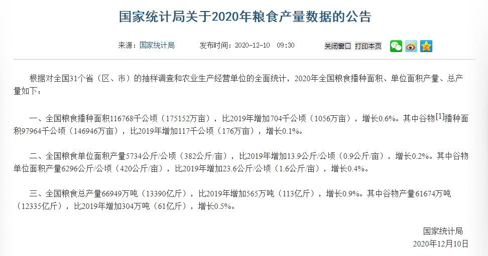 国家统计局昨日(10日)公布的全国粮食生产数据显示:2020年全国粮食总产量为13390亿斤,比上年增加113亿斤,增长0.9%,粮食生产再获丰收,产量连续6年保持在1.3万亿斤以上。