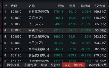 据Wind数据,截至午间收盘,采掘、钢铁、有色金属板块分别跌0.77%、1.43%、1.60%。