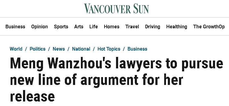△《温哥华太阳报》10日报道的标题《孟晚舟的律师为其获释寻求新的申诉理由》