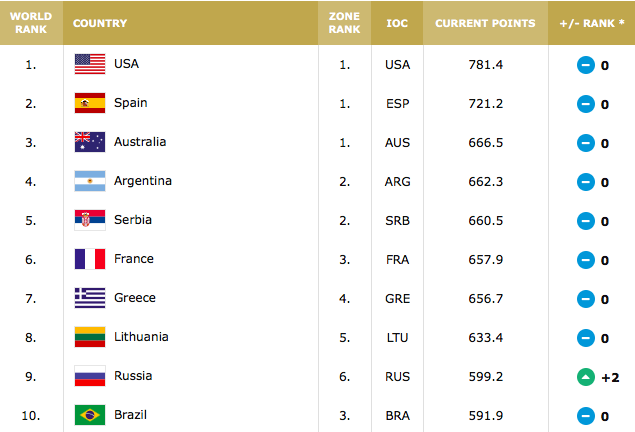 男篮世界排名前10的球队为美国、西班牙、澳大利亚、阿根廷、塞尔维亚、法国、希腊、立陶宛、俄罗斯和巴西队。
