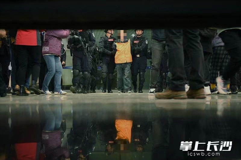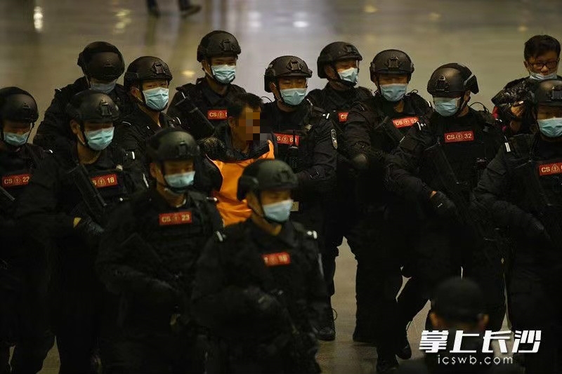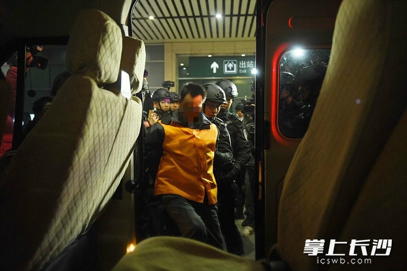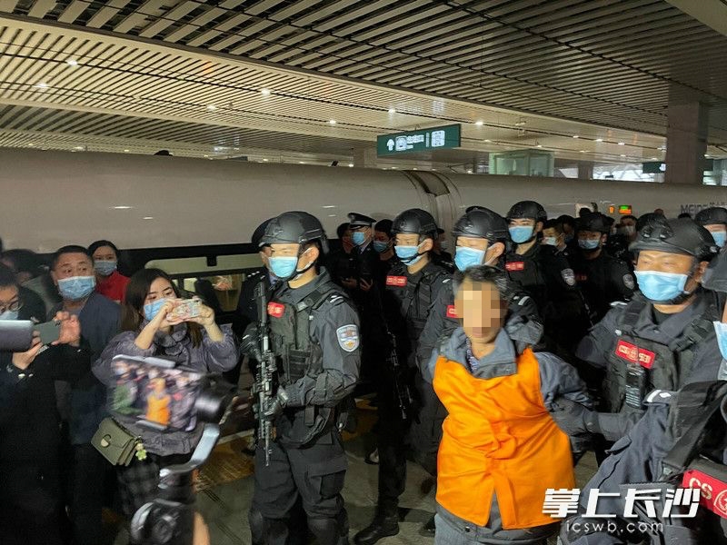 12月11日下午4时44分,长沙火车南站月台上警灯闪烁。随着G2339次列车准点驶入,在江西南昌落网的公安部A级通缉令逃犯张承禹戴着脚镣手铐,被长沙公安专案民警押下列车。随即,荷枪实弹的特警队员将其快速押上警车驶离。