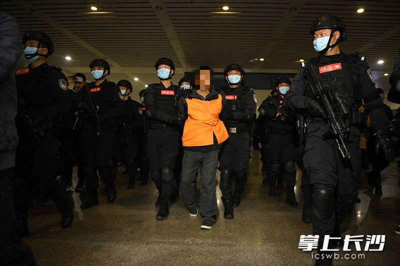 今日下午,身负6死2伤命案的A级通缉令逃犯张承禹被警方押解回长沙。(《长沙晚报》全媒体记者 黄启晴 摄)