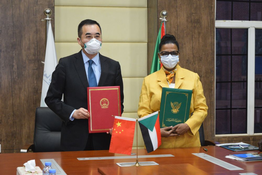 12月10日,在苏丹喀土穆,中国驻苏丹大使马新民(左)和苏丹代理财长希巴出席签字仪式。(新华社记者马意翀摄)